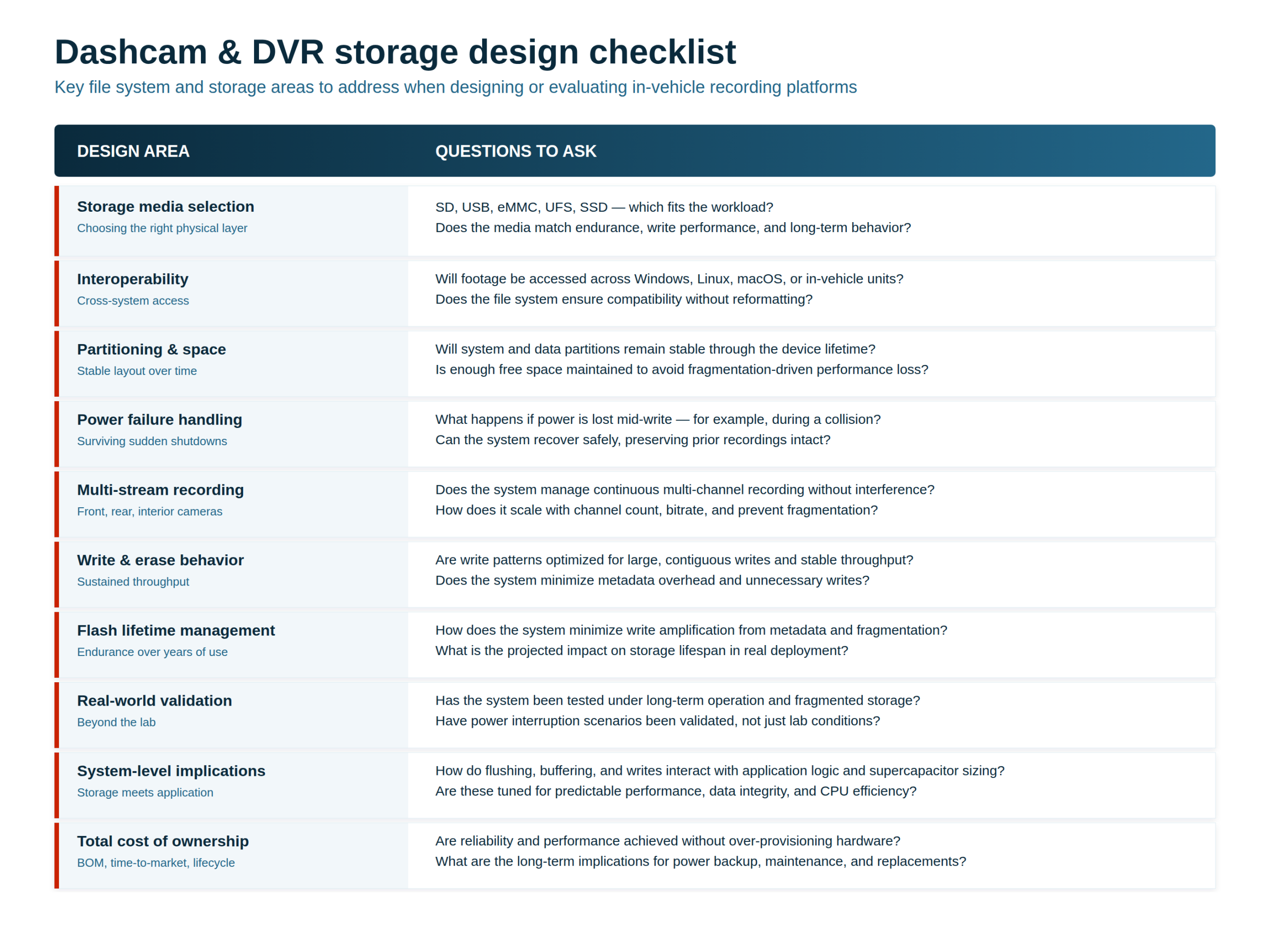 Design choices across the entire storage system, encompassing media selection, file system functionality, and integration at the system level, address this. The checklist below summarizes the key areas to address when designing or evaluating automotive dashcams or DVR platforms.